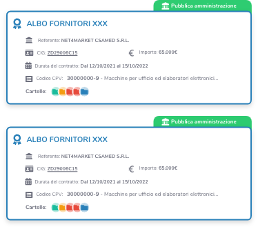 Raccogli le informazioni ufficiali su un potenziale Operatore Economico: ricerca per oggetto o per CIG e individua il contratto di tuo interesse. Inoltre, puoi trovare tutte le referenze cercando la ragione sociale dell’impresa referente.